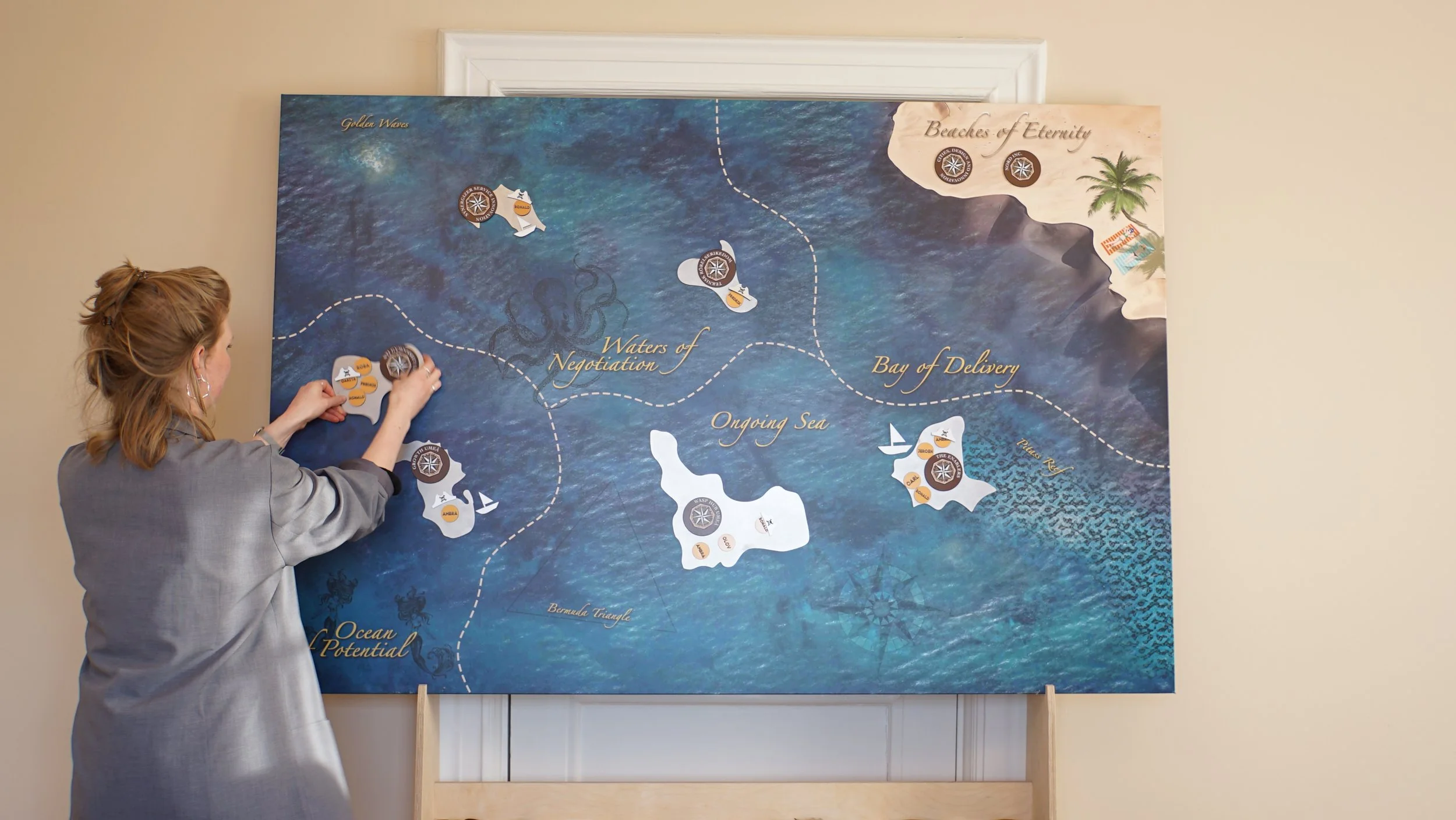 The SeaMap is an interactive tool that visualises the current status of projects and activities within a work environment. Through its visual qualities, the SeaMap offers an accessible way to navigate through different projects, competences, and skills. The tool aims to boost new collaborations by allowing co-workers to engage in each other’s work more easily.